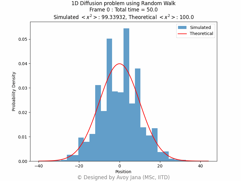 Number of particles, N = 100000 , unit step-size, Δx = 1.0 , unit step-time, Δt = 0.5